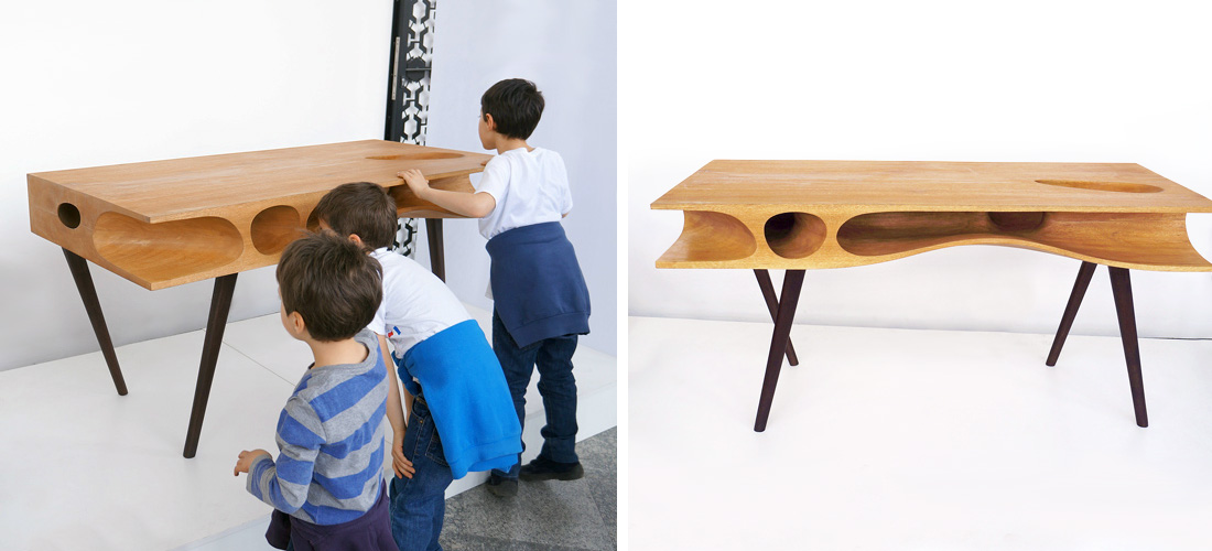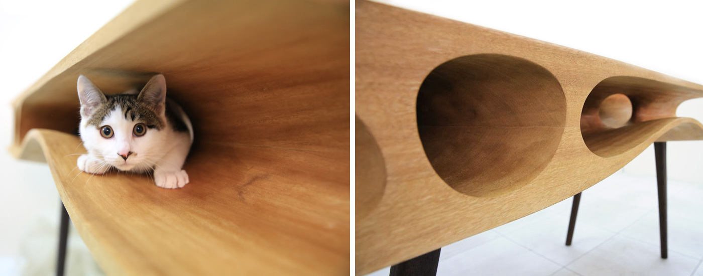 Столешница CATable, которая служит крышей кошачьему домику, изготовлена из цельного куска дерева и имеет лазы, которые были вырезаны вручную. Сложные криволинейные поверхности и пространства домика для кошки, плавные гладкие очертания дизайна стола, фактура дерева - не просто создают комфорт для домашнего животного. По-настоящему эффектный арт-объект, с неповторимой стилистикой гармонично дополнит рабочую зону квартиры, станет украшением ее интерьера.