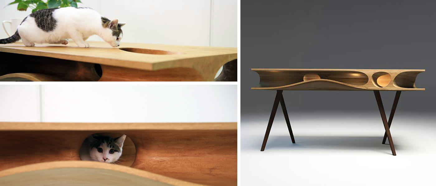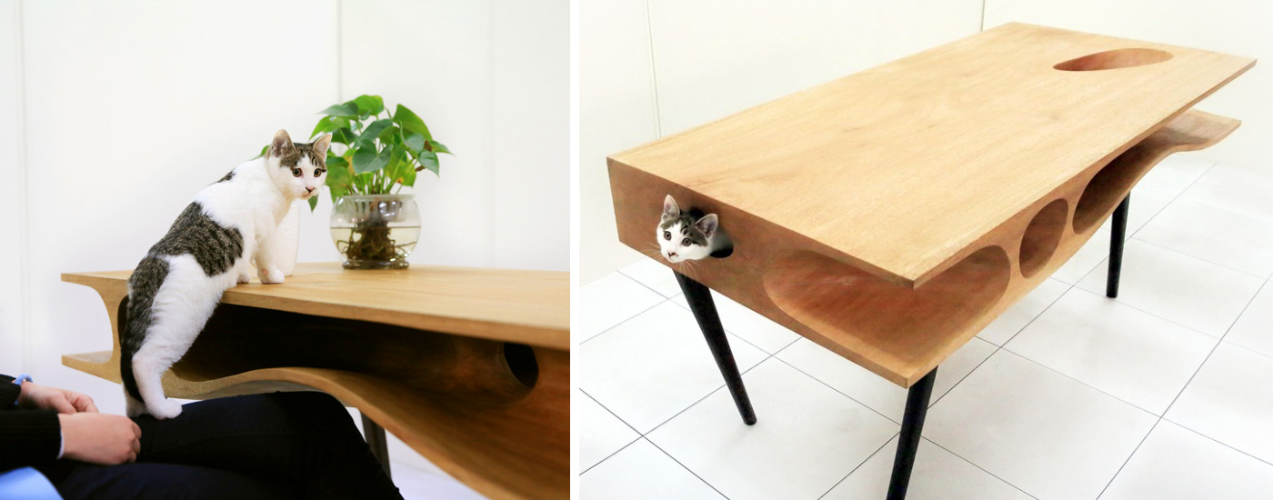 Компьютерный стол CATable дизайнер Руан Хао специально разрабатывал для любителей кошек, с целью занять этих непоседливых, активных животных, обеспечив им комфортное времяпрепровождение и отдых, без ущерба для человека. При этом, в непосредственной близости от любимого хозяина.