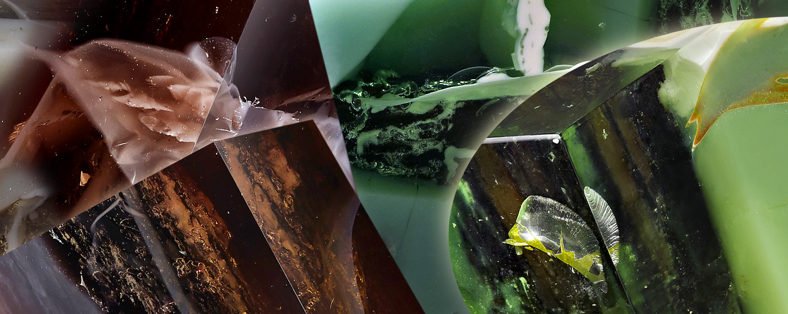 В каждой конструкции - игра непрозрачности и прозрачности, раскрывающая отдельные компоненты из стекловолокна, которые составляют несущую конструкцию. Реакция между двумя компонентами создает естественные трещины, которые соединяются в некий графический рисунок, напоминающий структуру горных пород. В результате такого взаимодействия получается арт-объект, напоминающий камень, рожденный глубоко под землей.