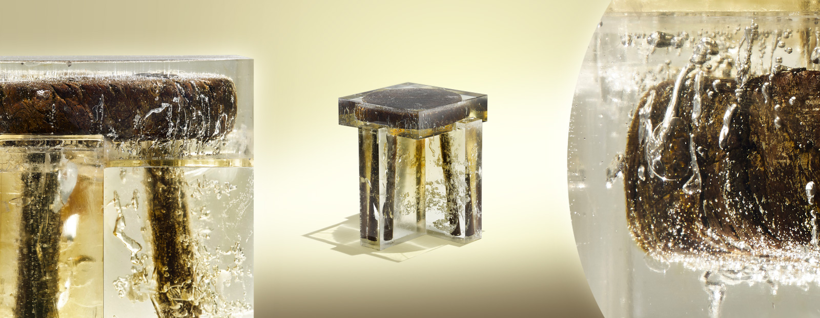 И коллекция табуретов «Jade». Здесь в эпоксидную смолу погружают органический материал – ствол 200-летнего итальянского дуба. В жидкий полимер добавляют пигмент, рождающий необычные цветовые сочетания, имитирующие полудрагоценные камни нефрит, либо обсидиан.