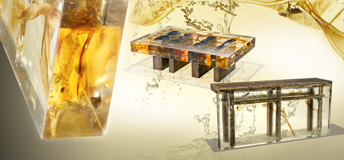 Самые известные коллекции Nucleo, которые постоянно дополняются новыми объектами: "Сувениры из прошлого века". В ней простая деревянная мебель заключена в твердых блоках блестящей золотой смолы, как насекомые, захваченные в янтаре.